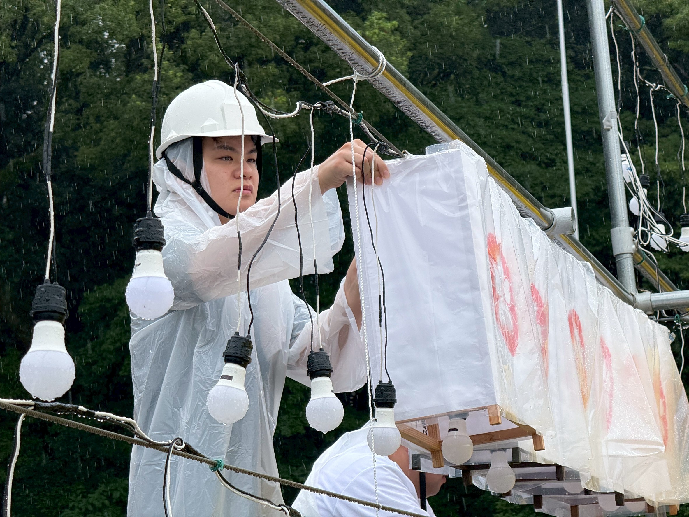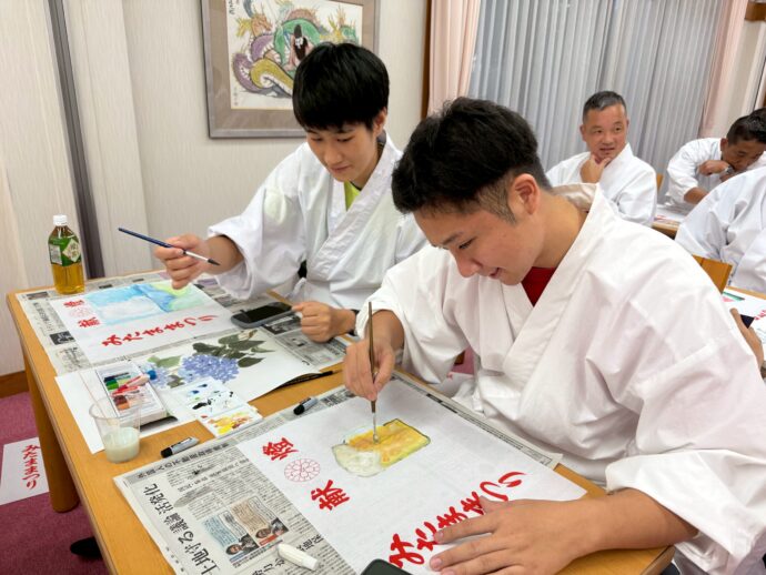 小雨の際は提灯取り付け作業を行い、荒天時には屋内にて提灯の絵付け作業を行いました。